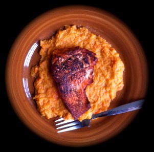 The hubby made salmon and sweet potato and carrot mash, one of my favorite meals. I was beside myself when I peered down at my plate.